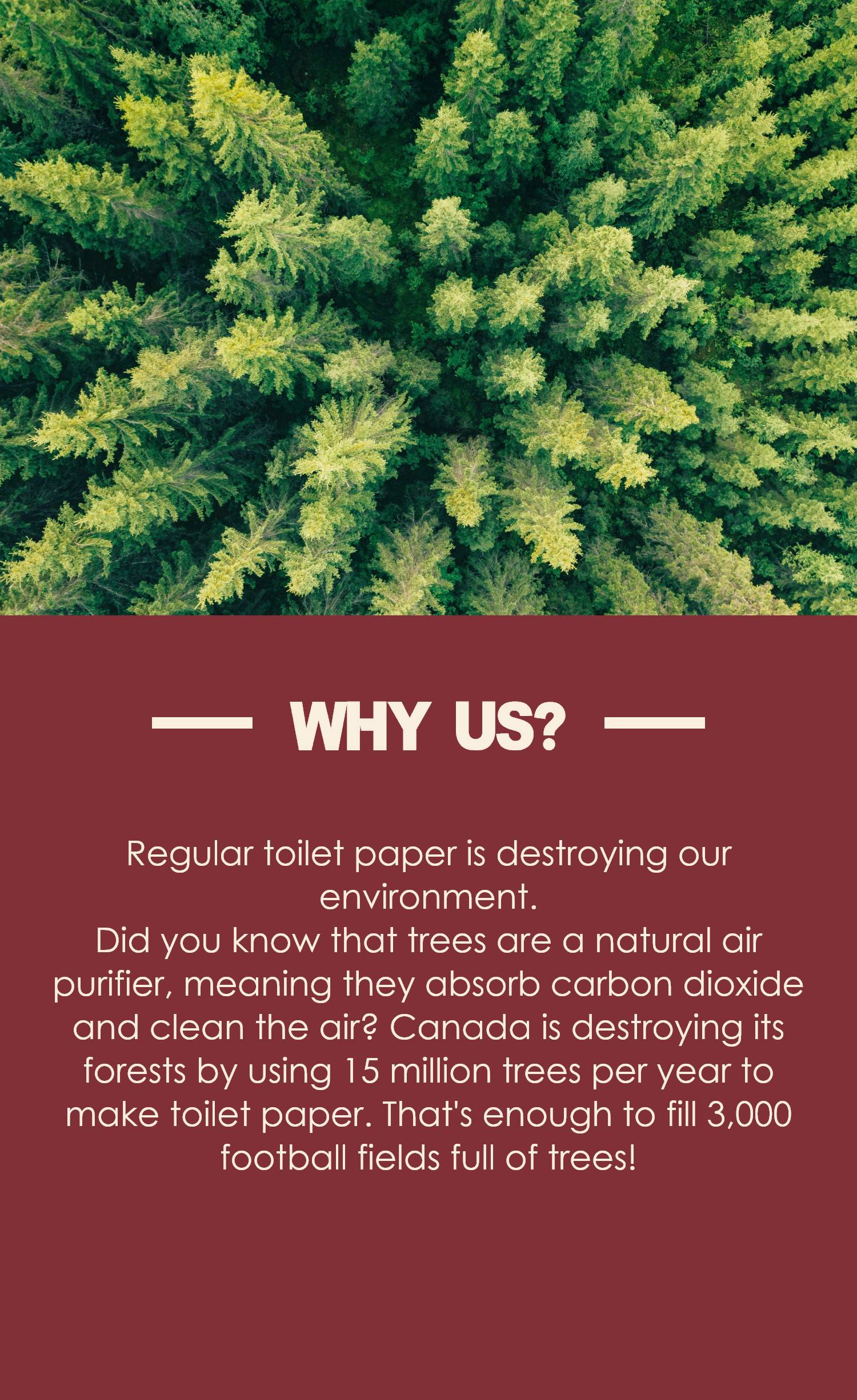 Did you know that trees are a natural air purifier, meaning they absorb carbon dioxide and clean the air? Canada is destroying its forests by using 15 million trees per year to make toilet paper. That's enough to fill 3,000 football fields full