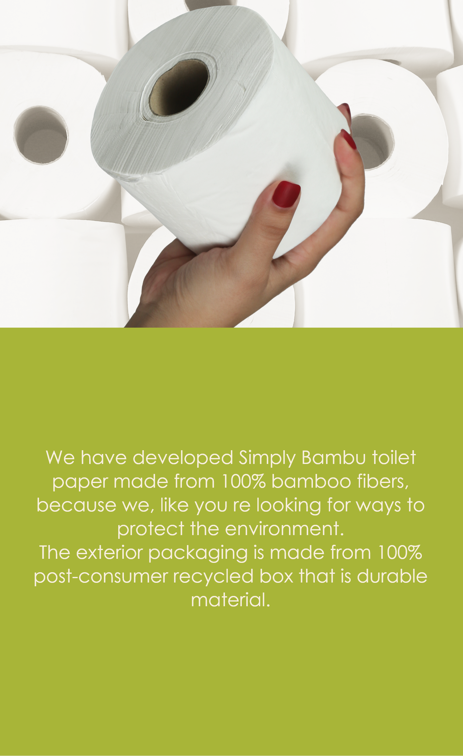 At Simply Bambu, we believe in creating a better world for future generations. That’s why we developed our toilet paper made from bamboo fibers – a renewable and sustainable resource. Bamboo grows quickly and abundantly, making it an excellent choice for toilet paper production. Plus, our toilet paper is packaged in 100% post-consumer recycled cardboard to further reduce our environmental footprint, and keep plastic out of landfills. With Simply Bambu, you can feel good about your choice for a cleaner, greener future.