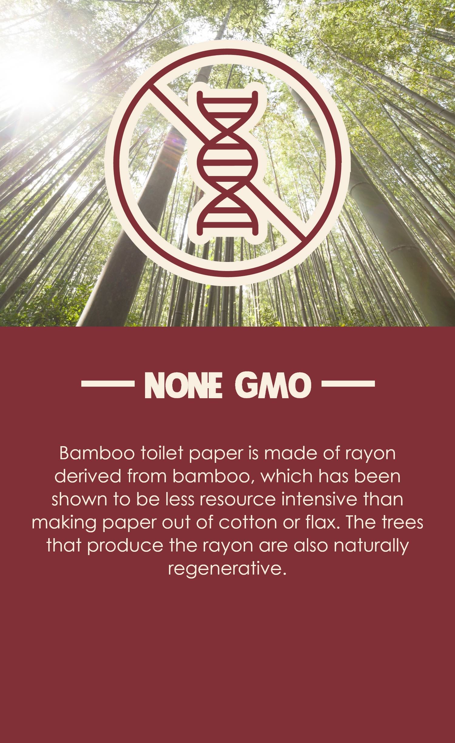 Bamboo toilet paper is made of rayon derived from bamboo, which has been shown to be less resource intensive than making paper out of cotton or flax. The trees that produce the rayon are also naturally regenerative.